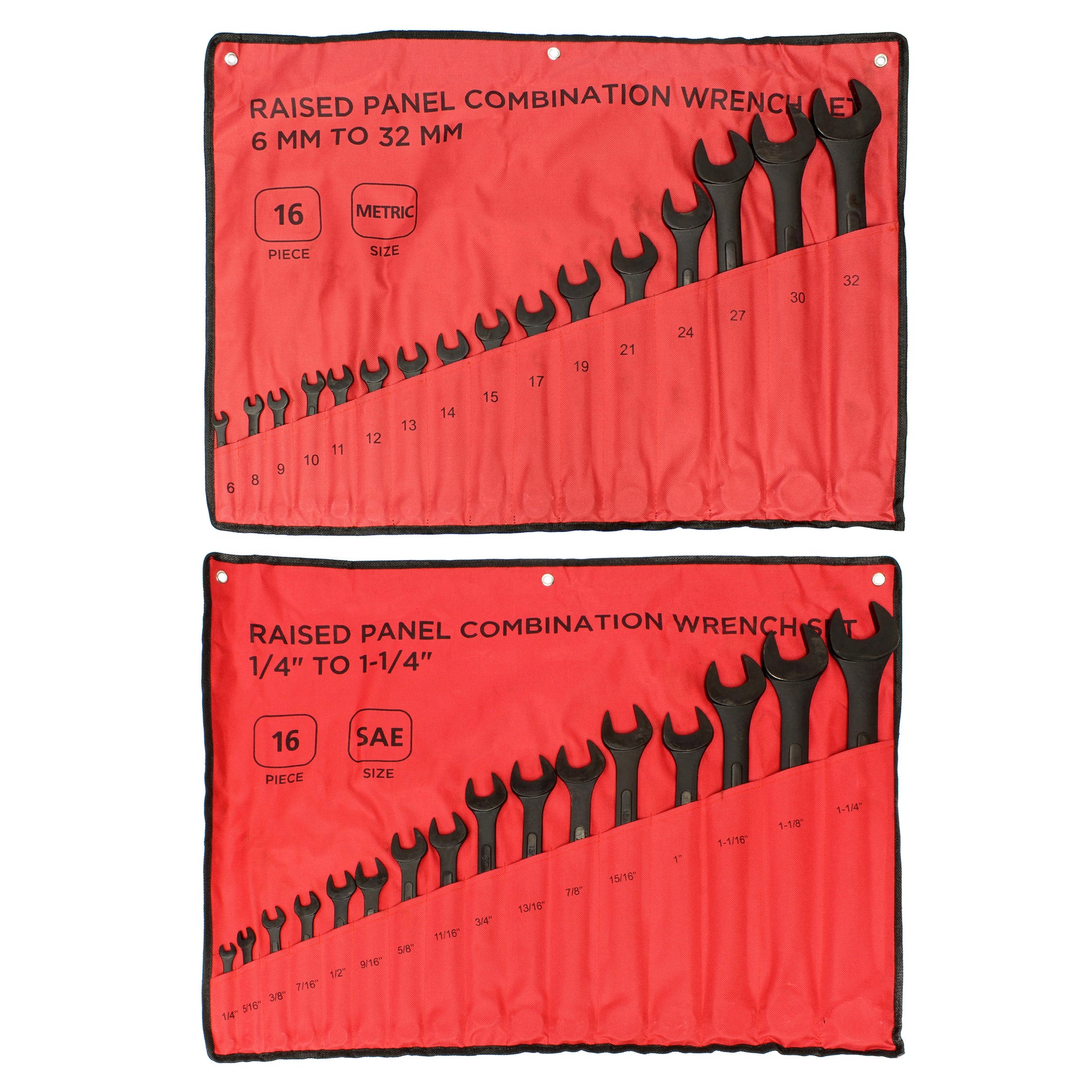 - CHOOSE YOUR WRENCH SET: Choose between our 16 Piece Metric Wrench Set with sizes 6mm to 32mm or our 16 Piece SAE Wrench Set with sizes from 1/4 inch to 1-1/4 inch; Each package includes a wrench pouch for your convenience