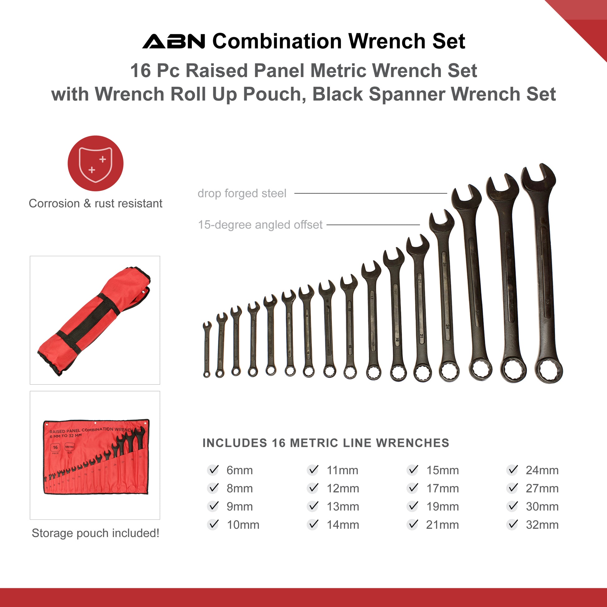- REMOVE DIFFICULT FASTENERS EASILY: The ABN | Raised Panel Combination Wrench Set Large Wrench Set offers increased clearance and minimizes slippage when used on hard-to-remove nuts and bolts; With an open-end style on one side to tighten and loosen bolts and a box-end on the other for leverage and a firm grip on nuts and bolts, these combination wrench sets are perfect for your project