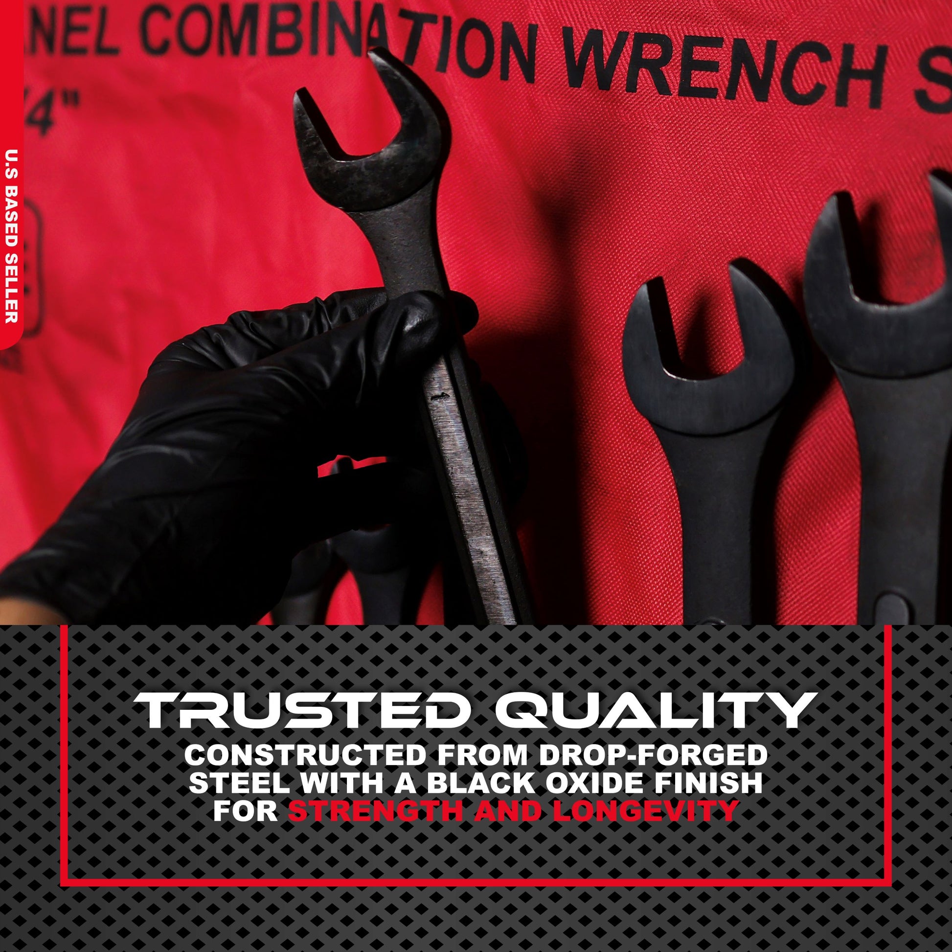 - BUILT TO LAST: Constructed from drop forged steel, these large wrench tools are designed for maximum durability, longevity, and torque; Black oxide finish provides resistance to rust, abrasion, and corrosion; Combination wrench set tools are permanently laser etched with sizing for quick identification; Box end is designed to grip flat sides of nuts and bolts to prevent wear to the fasteners