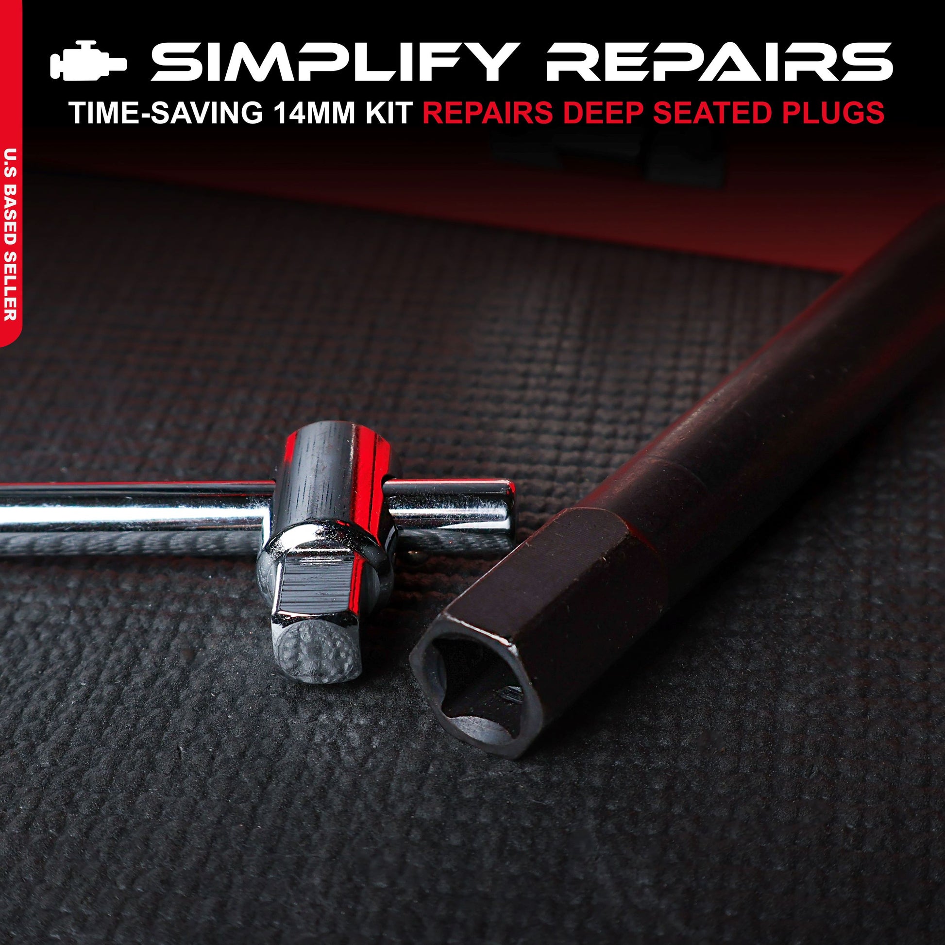 - REPAIR DEEP-SEATED PLUGS: The ABN Spark Plug Thread Repair Rethreading Set, 14mm Metric – Rethreading Tool Kit is a comprehensive and time-saving kit that incorporates taper and lug taps together with integrated ream to allow you to fix a stripped spark plug threaded port and repair deep-seated plug configurations